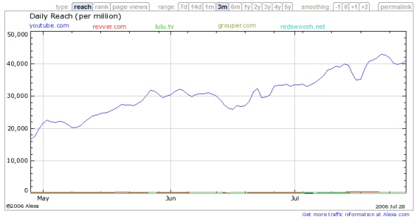 If you thought the social networking market was frothy, online video is rapidly expanding to fill all the bubble space. Jeff Jarvis observed that YouTube has now surpassed MySpace on Alexa (at least in reach) and speculates on who might buy YouTube — he also invited me to comment, and I’m going to take up the challenge by focusing on my favorite obscure corner of Web 2.0 — business models.